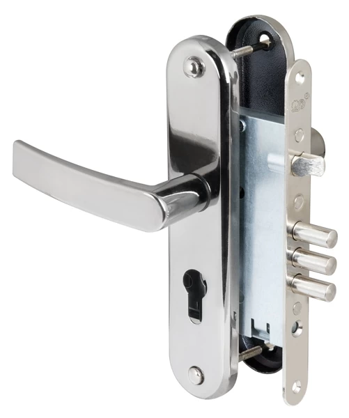 Замок врезной цилиндровый ЗВ4-31/55.РФ55-022.У4 с защелкой и фалевыми ручками предназначен для входных и внутренних дверей толщиной 40-50 мм жилых домов, квартир, торговых и конторских помещений. Замок универсальный, его можно устанавливать как в правые, так и в левые двери, переустановив защелку. Возможно использование замка с цилиндровым механизмом длиной 70 мм для установки в металлические двери. Межосевое расстояние 55 мм. Дверь может быть закрыта на защелку и открыта с помощью фалевой ручки при открытом засове замка. В комплекте: накладки с фалевыми ручками, цвет «черный жемчуг». Изготавливается с засовом из трех стальных стержней круглого сечения. Покрытие корпуса — цинковое. Покрытие лицевой и ответной планок — никелевое. Стальная защелка. Вылет ригелей — 22 мм, диаметр ригеля — 10,7 мм. Бэксет - 52,8 мм.